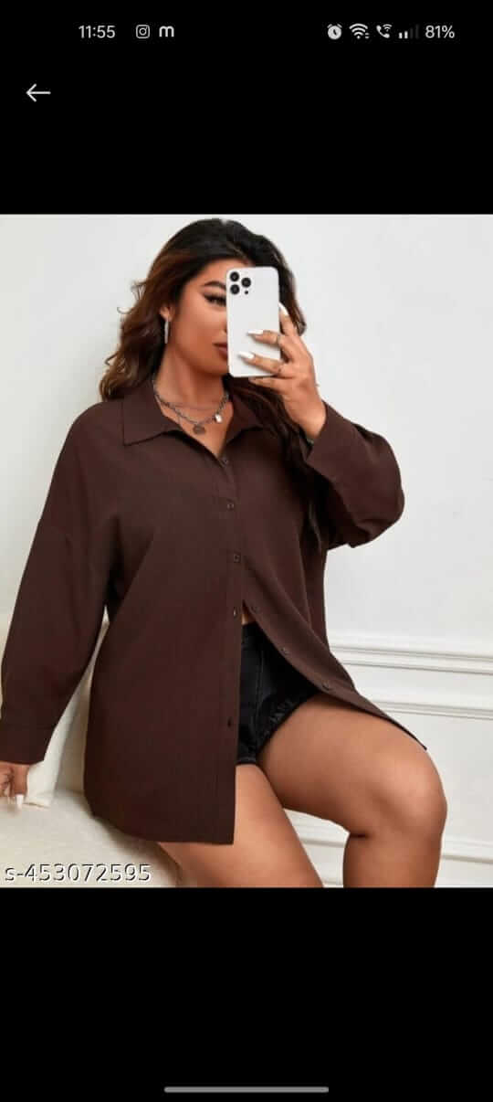 This women’s solid brown oversized shirt dress delivers a bold and modern fashion statement. Designed with a loose silhouette, classic collar, and front button closure, it can be styled as a shirt or worn as a short dress. The soft fabric provides comfort, while the oversized fit enhances a trendy and confident look, ideal for casual outings or party styling.